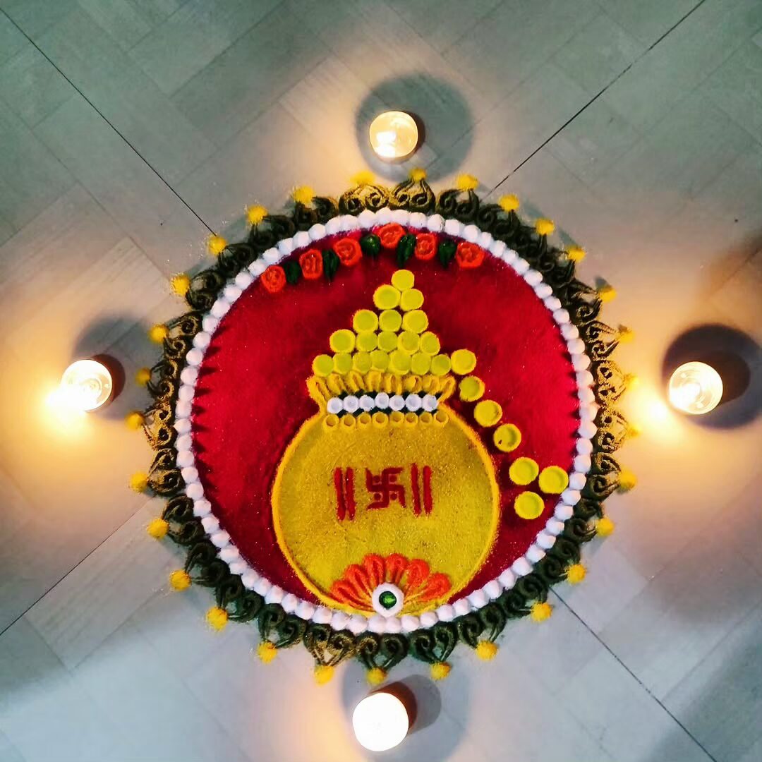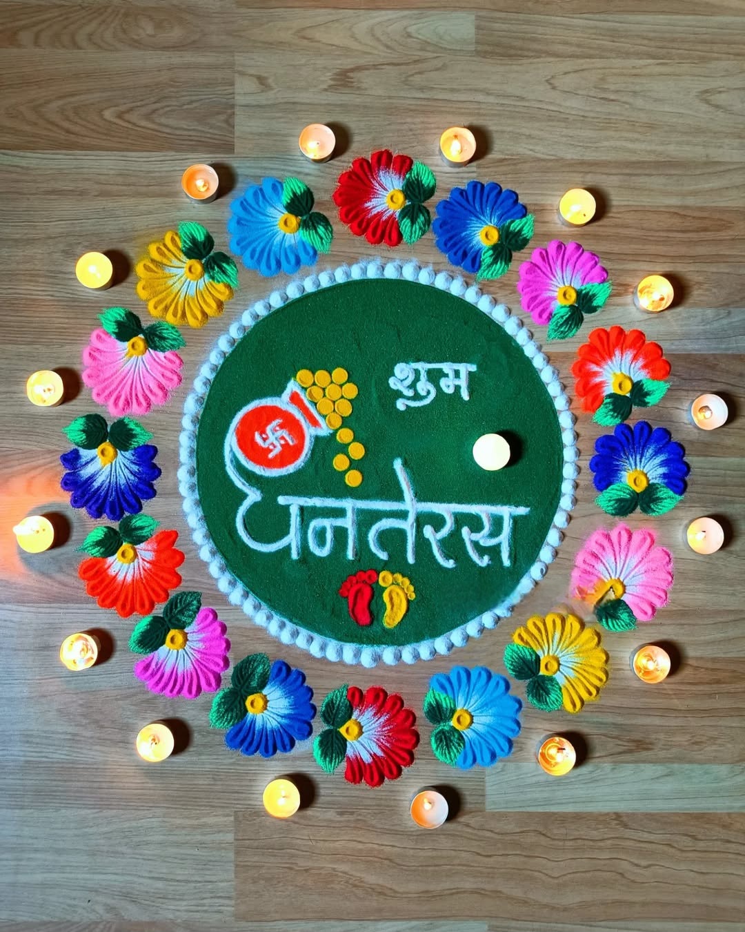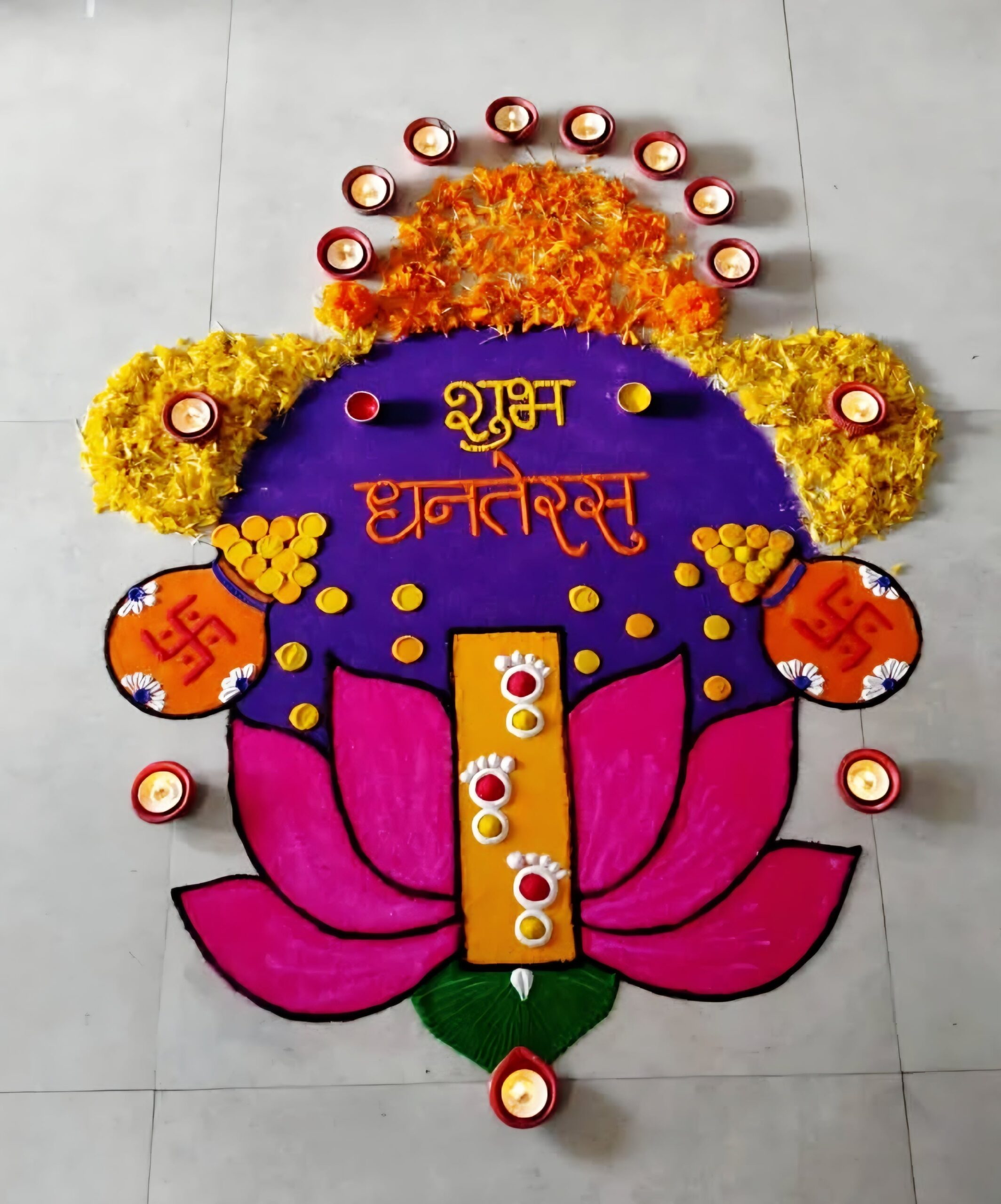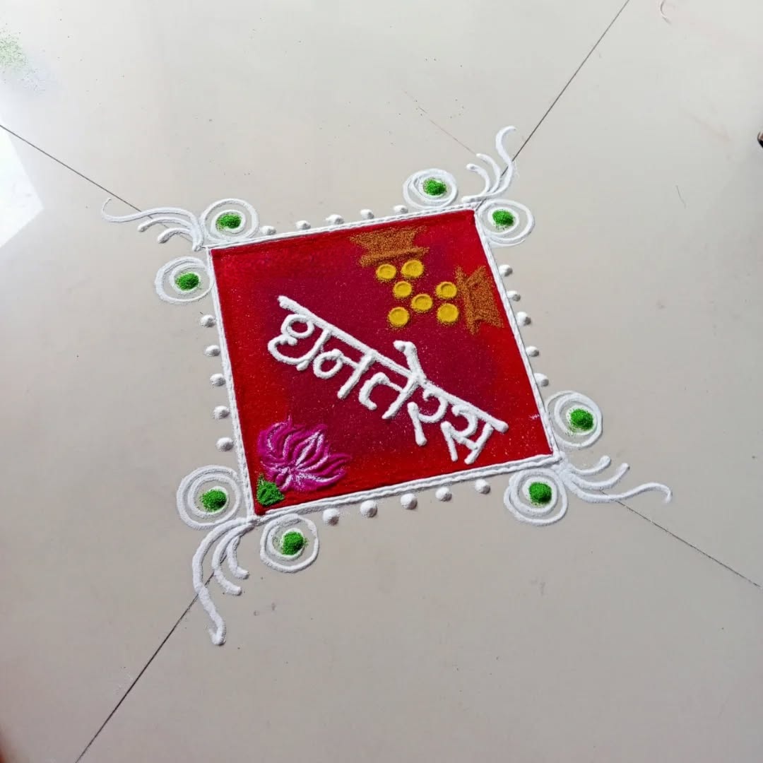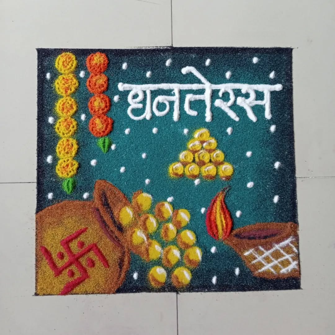 - दीपक वाली रंगोली: दीपक के आकार की रंगोली धनतेरस के पावन अवसर के लिए उपयुक्त है।