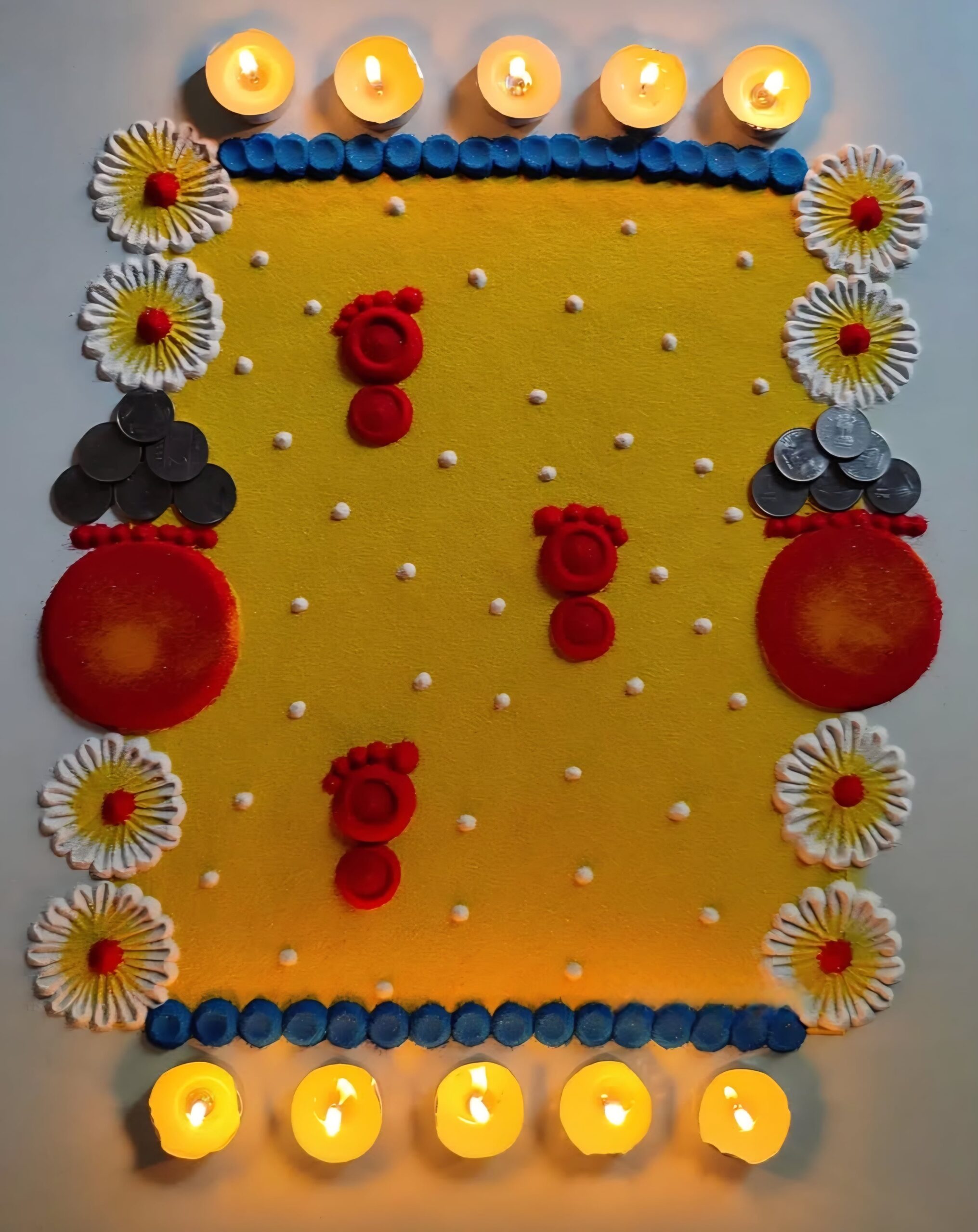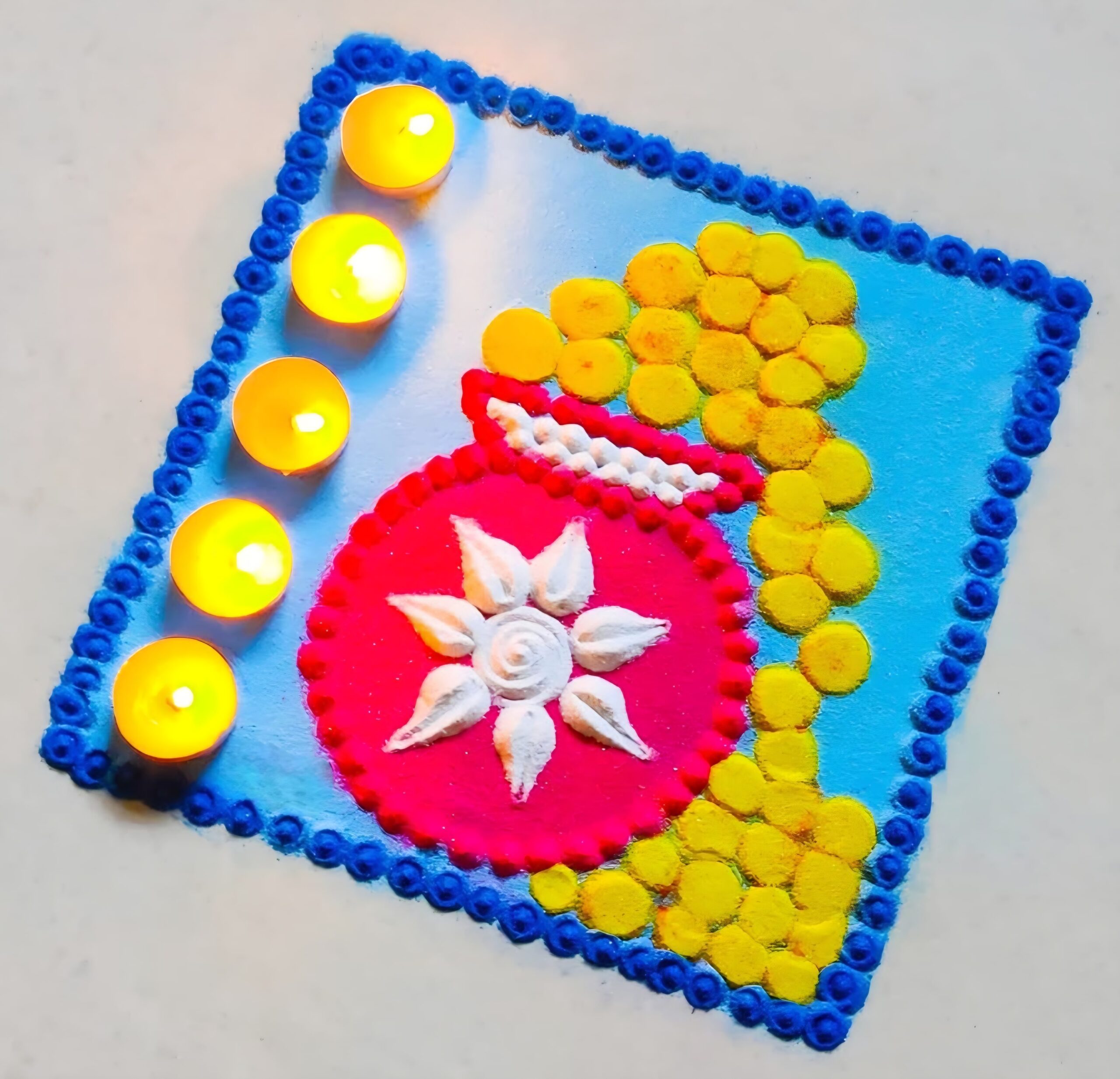- दीपक सजाना: रंगोली के किनारे छोटे दीपक लगाएँ ताकि यह और भी आकर्षक लगे।