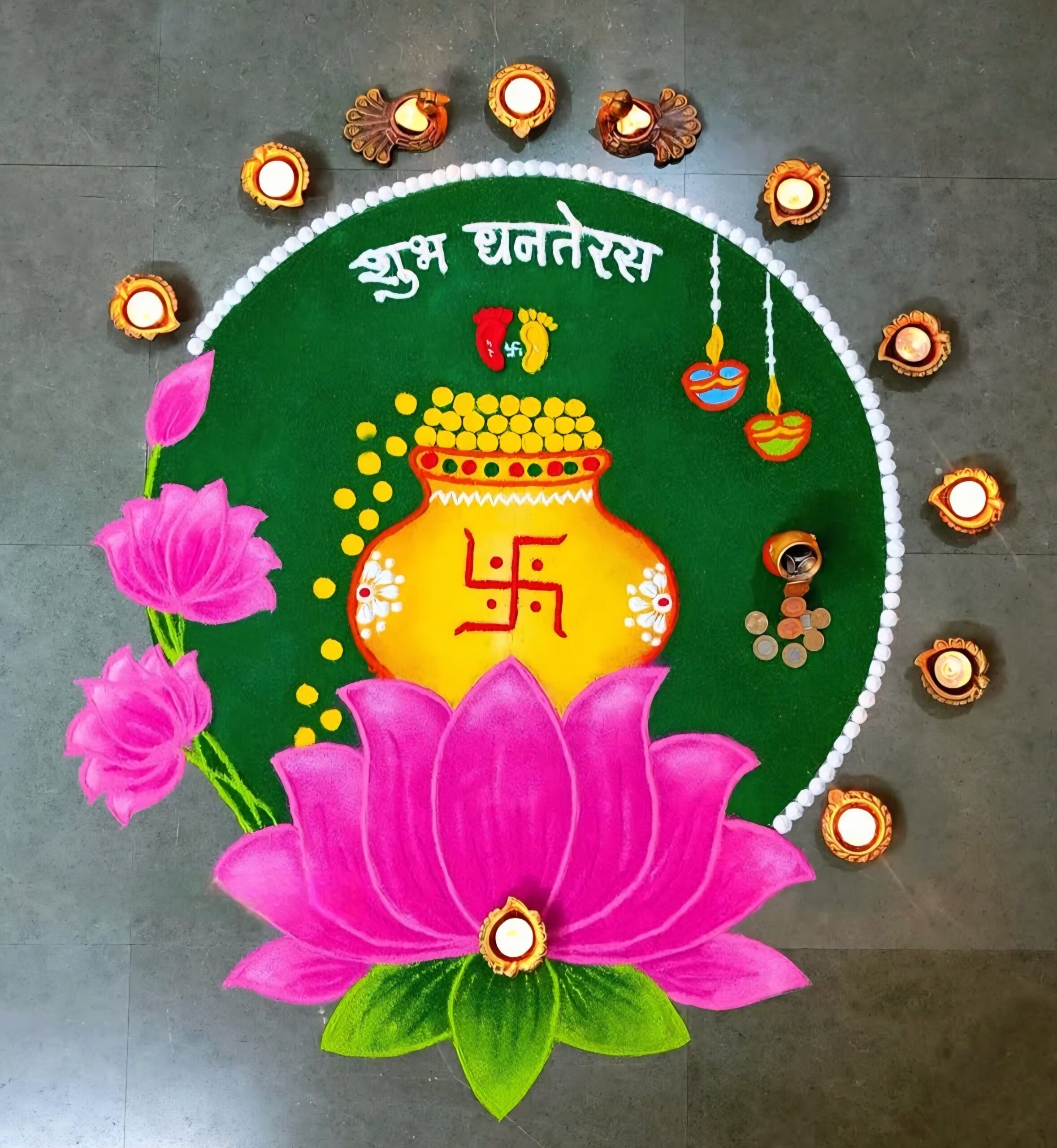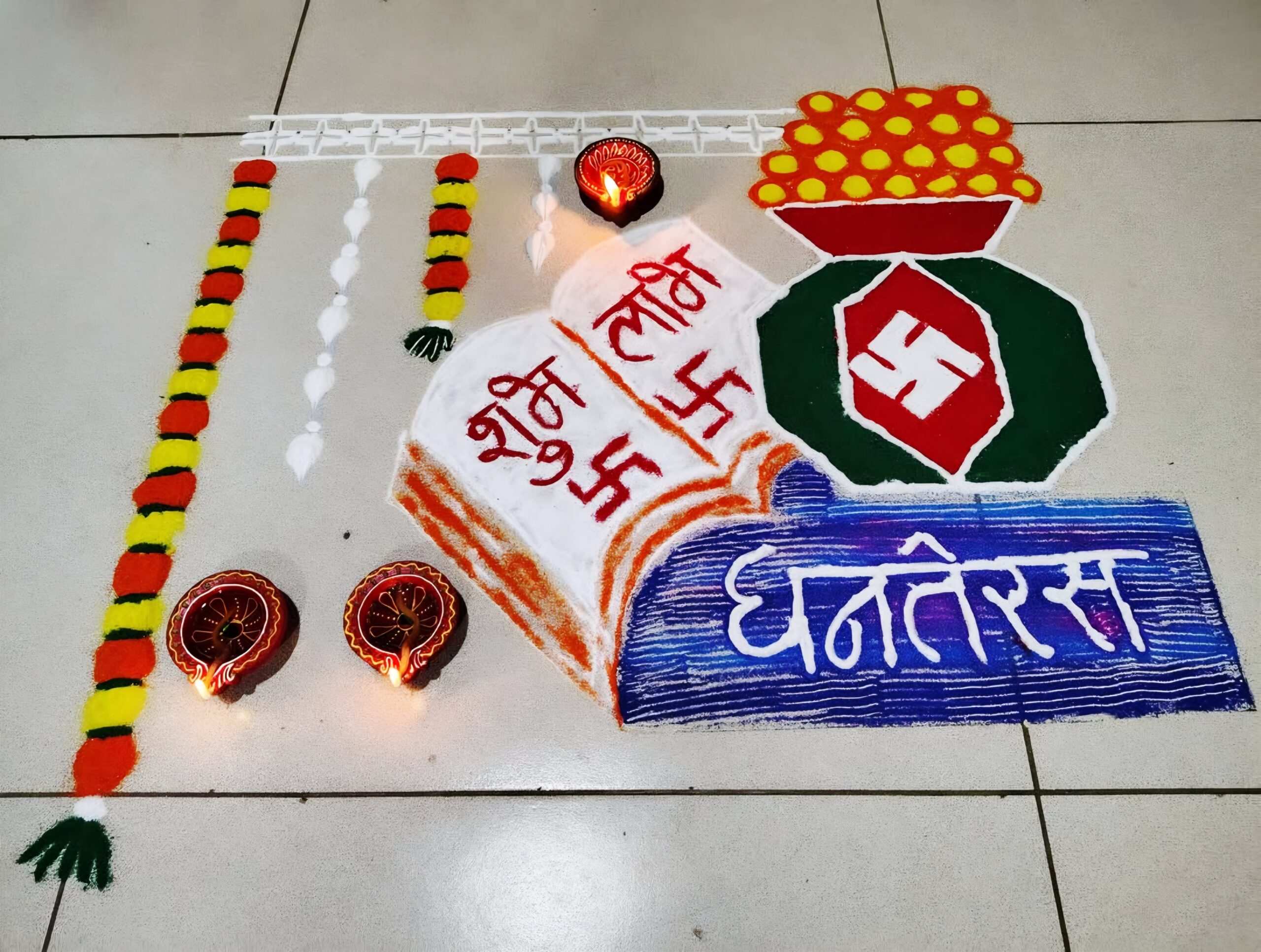 धनतेरस, दिवाली महापर्व का पहला दिन होता है। इस दिन घर की सफाई और सजावट के साथ-साथ रंगोली बनाना एक विशेष परंपरा है। रंगोली केवल सजावट का माध्यम नहीं है, बल्कि यह लक्ष्मी माता को आकर्षित करने और घर में समृद्धि लाने का प्रतीक भी है।